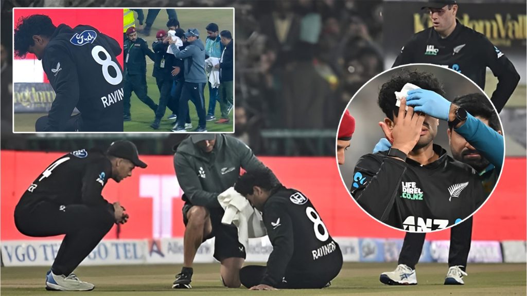 ಅತ್ತ ಬೌಂಡರಿ ಲೈನ್ನಲ್ಲಿದ್ದ ರಚಿನ್ ರವೀಂದ್ರ ಕ್ಯಾಚ್ ಹಿಡಿಯಲು ಓಡಿ ಬಂದಿದ್ದು, ಫೆಡ್ಲೈಟ್ ಬೆಳಕಿನಿಂದಾಗಿ ಚೆಂಡನ್ನು ಸರಿಯಾಗಿ ಗುರುತಿಸುವಲ್ಲಿ ಎಡವಿದ್ದಾರೆ. ಪರಿಣಾಮ ಬಾಲ್ ನೇರವಾಗಿ ಅವರ ಮುಖಕ್ಕೆ ಬಡಿದಿದೆ.