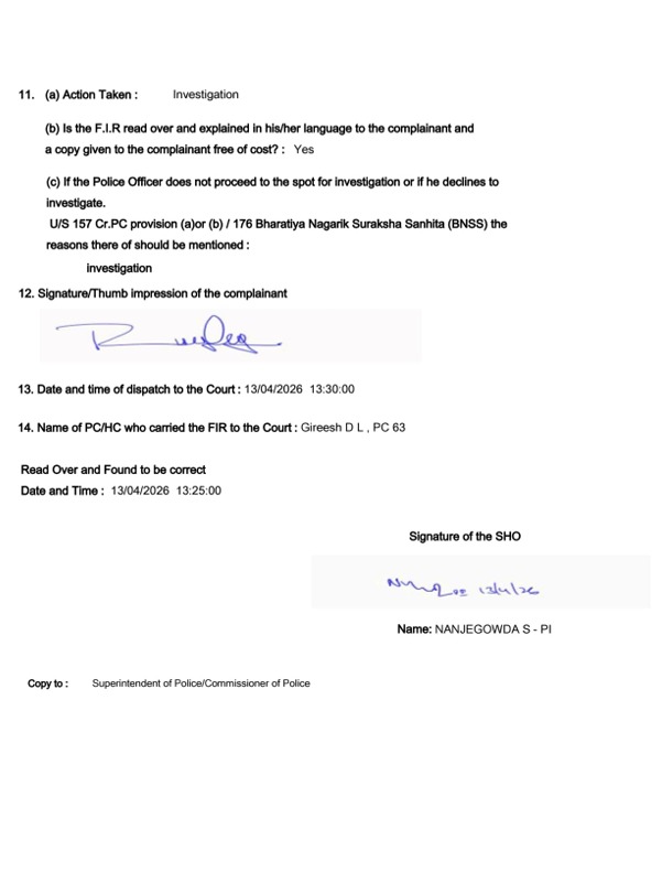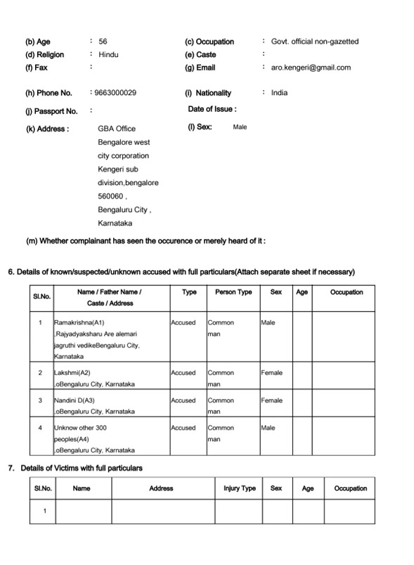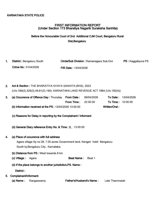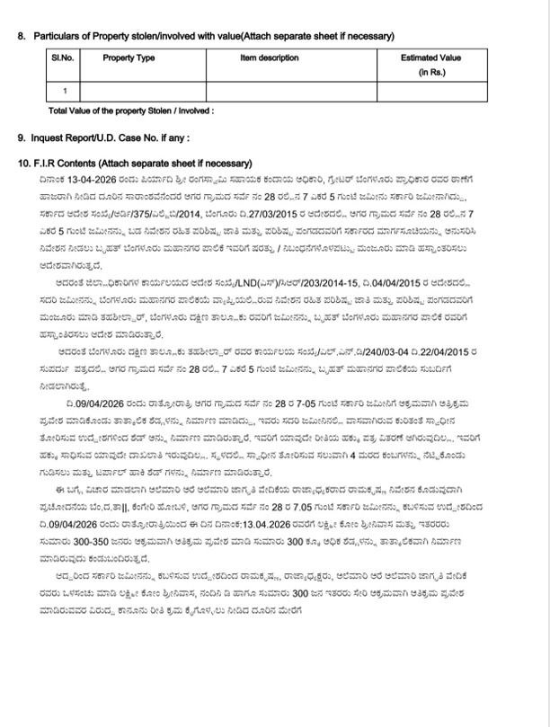 ಆದ್ದರಿಂದ ಸರ್ಕಾರಿ ಜಮೀನನ್ನು ಕಬಳಿಸಲು ಯತ್ನಿಸಿದ ಅಲೆಮಾರಿ ಅರೆ ಅಲೆಮಾರಿ ಜಾಗೃತಿ ವೇದಿಕೆ ರಾಜ್ಯಾಧ್ಯಕ್ಷ ರಾಮಕೃಷ್ಣ, ಲಕ್ಷ್ಮಿ ಕೋಂ ಶ್ರೀನಿವಾಸ, ನಂದಿನಿ ಡಿ ಹಾಗೂ ಸುಮಾರು 300 ಜನ ಇತರರು ಸೇರಿ ಅಕ್ರಮವಾಗಿ ಅತಿಕ್ರಮ ಪ್ರವೇಶ ಮಾಡಿರುವವರ ವಿರುದ್ಧ ಕಾನೂನು ರೀತಿ ಕ್ರಮ ಕೈಗೊಳ್ಳಲು ದೂರು ನೀಡಿದ್ದಾರೆ. ದೂರಿನ ಆಧಾರದ ಮೇಲೆ ಸರ್ಕಾರದ ಜಮೀನನ್ನು ಅಕ್ರಮವಾಗಿ ವಶಪಡಿಸಿಕೊಳ್ಳಲು ಸಂಚು ರೂಪಿಸಿದ ಆರೋಪಿಗಳ ವಿರುದ್ಧ ಕಗ್ಗಲಿಪುರ ಪೊಲೀಸ್ ಠಾಣೆಯಲ್ಲಿ FIR ದಾಖಲಾಗಿದೆ.