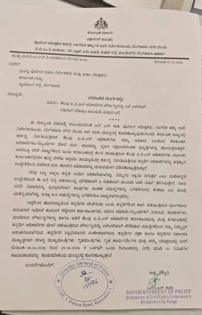 ಹೊರರಾಜ್ಯದಿಂದ ಕನ್ನಡಿಗರ ಸೇವೆಗೆಂದು ಬಂದು ಕನ್ನಡಿಗರಿಂದ ಕೂಲಿ ಪಡೆಯುತ್ತಿರುವ ಮಂಗಳೂರು ಕಮಿಷನರ್‌ವರ ಕರ್ಮಕಾಂಡಗಳು, ಅಧೀನ ಅಧಿಕಾರಿ/ಸಿಬ್ಬಂದಿಗೆ ನೀಡಿರುವ ಕಿರುಕುಳಗಳು. ಮಾಡಿರುವ ದೌರ್ಜನ್ಯಗಳನ್ನು ಹಾಗೂ ಇತರೆ ಕೆಲವು ಐಪಿಎಸ್ ಅಧಿಕಾರಿಗಳ ಕರ್ಮಕಾಂಡವನ್ನು ಮತ್ತು ಕರ್ನಾಟಕದಲ್ಲಿ ಕನ್ನಡಿಗ ಅಧಿಕಾರಿಗಳ ಮೇಲೆ ನಡೆಯುತ್ತಿರುವ ದೌರ್ಜನ್ಯವನ್ನು ಎಳೆಎಳೆಯಾಗಿ ತೆರೆದಿಡುವ ಸದುದ್ದೇಶದಿಂದ ಮುಕ್ತವಾಗಿ ಮಾತಾಡಿ, ಕರ್ಮಕಾಂಡ ಬಯಲು ಮಾಡಲು ಒಂದು ವಾರದೊಳಗೆ ಭೇಟಿಗೆ ಅವಕಾಶ ನೀಡುವಂತೆ ಮನವಿ ಮಾಡಿಕೊಂಡಿದ್ದಾರೆ.
