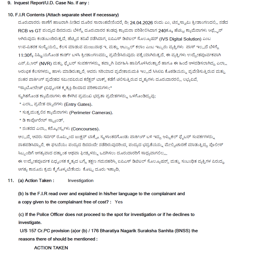 ಕ್ರೀಡಾಂಗಣವನ್ನು ಪ್ರವೇಶಿಸಿದ ಆರೋಪಿಗಳು, ಎನ್ವಿಆರ್ (NVR) ಮತ್ತು ಫೈಬರ್ ಸಂಪರ್ಕಗಳನ್ನು ಉದ್ದೇಶಪೂರ್ವಕವಾಗಿ ತಪ್ಪು ತಪ್ಪಾಗಿ ನಿರ್ವಹಿಸಿ ಅವುಗಳನ್ನು ಕತ್ತರಿಸಿ ಹಾನಿಗೊಳಿಸಿದ್ದಾರೆ. ಇದರಿಂದಾಗಿ ಸಿಸಿಟಿವಿ ಕ್ಯಾಮೆರಾಗಳ ಸಂಪರ್ಕ ಕಡಿತಗೊಂಡಿತ್ತು.