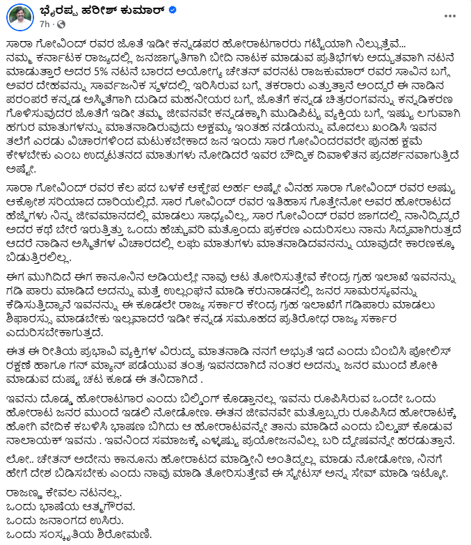 ನಮ್ಮ ಕರ್ನಾಟಕ ರಾಜ್ಯದಲ್ಲಿ ಜನಜಾಗೃತಿಗಾಗಿ ಬೀದಿ ನಾಟಕ ಮಾಡುವ ಪ್ರತಿಭೆಗಳು ಅದ್ಭುತವಾಗಿ ನಟನೆ ಮಾಡುತ್ತಾರೆ. ಅದರ 5% ನಟನೆ ಬಾರದ ಅಯೋಗ್ಯ ಚೇತನ್ ವರನಟ ರಾಜಕುಮಾರ್ ರವರ ಸಾವಿನ ಬಗ್ಗೆ ಅವರ ದೇಹವನ್ನು ಸಾರ್ವಜನಿಕ ಸ್ಥಳದಲ್ಲಿ ಇರಿಸಿರುವ ಬಗ್ಗೆ ತಕರಾರು ಎತ್ತುತ್ತಾನೆ. ಅಂದರೆ ಈ ನಾಡಿನ ಪರಂಪರೆ ಕನ್ನಡ ಅಸ್ಮಿತೆಗಾಗಿ ದುಡಿದ ಮಹನೀಯರ ಬಗ್ಗೆ ಜೊತೆಗೆ ಕನ್ನಡ ಚಿತ್ರರಂಗವನ್ನು ಕನ್ನಡಿಕರಣ ಗೊಳಿಸುವುದರ ಜೊತೆಗೆ ಇಡೀ ತಮ್ಮ ಜೀವನವೇ ಕನ್ನಡಕ್ಕಾಗಿ ಮುಡಿಪಿಟ್ಟ ವ್ಯಕ್ತಿಯ ಬಗ್ಗೆ ಇಷ್ಟು ಲಗುವಾಗಿ ಹಗುರ ಮಾತುಗಳನ್ನು ಮಾತನಾಡಿರುವುದು ಅಕ್ಷಮ್ಯ. ಇಂತಹ ನಡೆಯನ್ನು ಮೊದಲು ಖಂಡಿಸಿ ಇವನ ತಲೆಗೆ ಎರಡು ವಿಚಾರಗಳಿಂದ ಮಟುಕಬೇಕಾದ ಜನ ಇಂದು ಸಾರ ಗೋವಿಂದರವರೇ ಪುನಹ ಕ್ಷಮೆ ಕೇಳಬೇಕು ಎಂಬ ಉದ್ಧಟತನದ ಮಾತುಗಳು ನೋಡಿದರೆ ಇವರ ಬೌದ್ಧಿಕ ದಿವಾಳಿತನ ಪ್ರದರ್ಶನವಾಗುತ್ತಿದೆ ಅಷ್ಟೇ ಎಂದು ಭೈರಪ್ಪ ಹರೀಶ್ ಕುಮಾರ್ ಕಿಡಿ ಕಾರಿದ್ದಾರೆ.