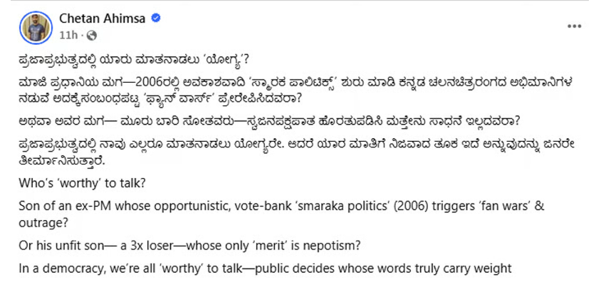 ಪ್ರಜಾಪ್ರಭುತ್ವದಲ್ಲಿ ಯಾರು ಮಾತನಾಡಲು ‘ಯೋಗ್ಯ’?. ಮಾಜಿ ಪ್ರಧಾನಿಯ ಮಗ, 2006ರಲ್ಲಿ ಅವಕಾಶವಾದಿ ‘ಸ್ಮಾರಕ ಪಾಲಿಟಿಕ್ಸ್’ ಶುರು ಮಾಡಿ ಕನ್ನಡ ಚಲನಚಿತ್ರರಂಗದ ಅಭಿಮಾನಿಗಳ ನಡುವೆ ಅದಕ್ಕೆ ಸಂಬಂಧಪಟ್ಟ ‘ಫ್ಯಾನ್ ವಾರ್ಸ್’ ಪ್ರೇರೇಪಿಸಿದವರಾ? ಅಥವಾ ಅವರ ಮಗ, ಮೂರು ಬಾರಿ ಸೋತವರು, ಸ್ವಜನಪಕ್ಷಪಾತ ಹೊರತುಪಡಿಸಿ ಮತ್ತೇನು ಸಾಧನೆ ಇಲ್ಲದವರಾ?’ ಎಂದು ಟೀಕಿಸಿದ್ದಾರೆ.