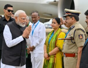 ಇಂದು ಬೆಳಿಗ್ಗೆ ದೆಹಲಿಯಿಂದ ವಿಶೇಷ ವಿಮಾನದ ಮೂಲಕ ಎಚ್ಎಲ್ ವಿಮಾನನಿಲ್ದಾಣಕ್ಕೆ ಆಗಮಿಸಿದ ಮೋದಿಯವರನ್ನು ಮಾಜಿ ಸಿಎಂ ಯಡಿಯೂರಪ್ಪ, ವಿಪಕ್ಷ ನಾಯಕ ಆರ್.ಅಶೋಕ್, ಮುಖ್ಯ ಕಾರ್ಯದರ್ಶಿ ಶಾಲಿನಿ ರಜನೀಶ್, ನಗರ ಪೊಲೀಸ್ ಆಯುಕ್ತ ಸೀಮಂತ್ಕುಮಾರ್ ಸಿಂಗ್, ಪೊಲೀಸ್ ಮಹಾ ನಿರ್ದೇಶಕ ಸಲೀಂ ಸೇರಿದಂತೆ ಮತ್ತಿತರರು ಬರಮಾಡಿಕೊಂಡರು. ಪ್ರಧಾನಿ ನರೇಂದ್ರ ಮೋದಿ ಬೆಂಗಳೂರಿಗೆ ಆಗಮಿಸುವ ಹಿನ್ನೆಲೆ ನಗರದೆಲ್ಲೆಡೆ ಬಿಗಿ ಪೊಲೀಸ್ ಬಂದೋಬಸ್ತ್ ಏರ್ಪಡಿಸಲಾಗಿದೆ.