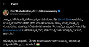 ಈ ಬಗ್ಗೆ ಹೆಚ್.ಡಿ ಕುಮಾರಸ್ವಾಮಿ ಅವರು ಸಾಮಾಜಿಕ ಜಾಲತಾಣದಲ್ಲಿ ಪೋಸ್ಟ್ ಹಂಚಿಕೊಂಡಿದ್ದಾರೆ. ಅಮಿತ್ ಶಾ ಅವರ ಸಂಸತ್ ಕಚೇರಿಯಲ್ಲಿ ಭೇಟಿ ಮಾಡಿ ಮಾತುಕತೆ ನಡೆಸಿದ್ದು, ರಾಜ್ಯ ಮತ್ತು ರಾಷ್ಟ್ರಕ್ಕೆ ಸಂಬಂಧಿಸಿದ ಮಹತ್ವದ ವಿಷಯಗಳು ಸೇರಿದಂತೆ ಪ್ರಧಾನಿ ನರೇಂದ್ರ ಮೋದಿ ಅವರ ನೇತೃತ್ವದಲ್ಲಿ ನಡೆಯುತ್ತಿರುವ ಅಭಿವೃದ್ಧಿಗಳ ಬಗ್ಗೆ ಚರ್ಚೆ ಮಾಡಲಾಯಿತು ಎಂದು ಕುಮಾರಸ್ವಾಮಿ ಹೇಳಿದ್ದಾರೆ.