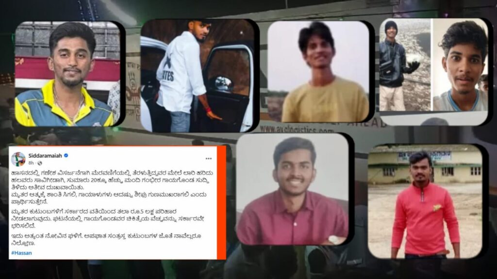 ಮೃತಪಟ್ಟವರ ಕುಟುಂಬಕ್ಕೆ ತಲಾ 5 ಲಕ್ಷ ರೂ. ಘೋಷಣೆ : ದುರಂತದಲ್ಲಿ ಮೃತಪಟ್ಟ ಕುಟುಂಬಗಳಿಗೆ ತಲಾ 5 ಲಕ್ಷ ರೂ. ಪರಿಹಾರವನ್ನು ರಾಜ್ಯ ಸರ್ಕಾರ ಘೋಷಣೆ ಮಾಡಿದೆ. ಈ ಘಟನೆ ಟ್ವೀಟ್ ಮಾಡಿರುವ ಸಿದ್ದರಾಮಯ್ಯ, ಹಾಸನದಲ್ಲಿ ಗಣೇಶ ವಿಸರ್ಜನೆಗಾಗಿ ಮೆರವಣಿಗೆಯಲ್ಲಿ ತೆರಳುತ್ತಿದ್ದವರ ಮೇಲೆ ಲಾರಿ ಹರಿದು ಹಲವರು ಸಾವಿಗೀಡಾಗಿ, ಸುಮಾರು 20ಕ್ಕೂ ಹೆಚ್ಚು ಮಂದಿ ಗಂಭೀರ ಗಾಯಗೊಂಡ ಸುದ್ದಿ ತಿಳಿದು ಅತೀವ ದುಃಖವಾಯಿತು. ಮೃತರ ಆತ್ಮಕ್ಕೆ ಶಾಂತಿ ಸಿಗಲಿ, ಗಾಯಾಳುಗಳು ಆದಷ್ಟು ಶೀಘ್ರ ಗುಣಮುಖರಾಗಲಿ ಎಂದು ಪ್ರಾರ್ಥಿಸುತ್ತೇನೆ. ಮೃತರ ಕುಟುಂಬಗಳಿಗೆ ಸರ್ಕಾರದ ವತಿಯಿಂದ ತಲಾ ರೂ.5 ಲಕ್ಷ ಪರಿಹಾರ ನೀಡಲಾಗುವುದು. ಘಟನೆಯಲ್ಲಿ ಗಾಯಗೊಂಡವರ ಚಿಕಿತ್ಸೆಯ ವೆಚ್ಚವನ್ನು ಸರ್ಕಾರವೇ ಭರಿಸಲಿದೆ ಎಂದು ತಿಳಿಸಿದ್ದಾರೆ.