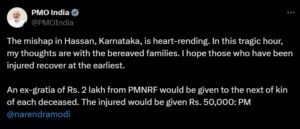 ಇದೀಗ ಹಾಸನ ದುರಂತಕ್ಕೆ ಪ್ರಧಾನಿ ನರೇಂದ್ರ ಮೋದಿ ಕಂಬನಿ ಮಿಡಿದಿದ್ದಾರೆ. ಕರ್ನಾಟಕದ ಹಾಸನದಲ್ಲಿ ನಡೆದ ಅಪಘಾತವು ಹೃದಯ ವಿದ್ರಾವಕವಾಗಿದೆ. ಗಾಯಗೊಂಡವರು ಆದಷ್ಟು ಬೇಗ ಚೇತರಿಸಿಕೊಳ್ಳಬೇಕೆಂದು ಹಾರೈಸುತ್ತೇನೆ. ಮೃತರ ಪ್ರತಿ ಸಂಬಂಧಿಕರಿಗೆ PMNRFನಿಂದ 2 ಲಕ್ಷ ರೂ. ಪರಿಹಾರ ನೀಡಲಾಗುವುದು. ಗಾಯಾಳುಗಳಿಗೆ 50,000 ರೂ. ನೀಡಲಾಗುವುದು ಎಂದು ತಿಳಿಸಿದ್ದಾರೆ.