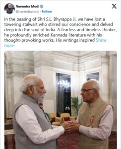 ಪ್ರಧಾನಿ ನರೇಂದ್ರ ಮೋದಿ ತಮ್ಮ ಸಂತಾಪ ಸಂದೇಶದಲ್ಲಿ, “ಡಾ. ಎಸ್.ಎಲ್. ಭೈರಪ್ಪರ ಅಗಲಿಕೆಯಿಂದ ನಾವು ನಮ್ಮ ಆತ್ಮಸಾಕ್ಷಿಯನ್ನು ತಟ್ಟಿದ, ಭಾರತದ ಆತ್ಮವನ್ನು ಆಳವಾಗಿ ಅಧ್ಯಯನ ಮಾಡಿದ ಮಹಾನ್ ಚಿಂತಕರೊಬ್ಬರನ್ನು ಕಳೆದುಕೊಂಡಿದ್ದೇವೆ. ಅವರು ನಿರ್ಭೀತ ಹಾಗೂ ಕಾಲಾತೀತ ಚಿಂತಕರಾಗಿದ್ದು, ತಮ್ಮ ಗಂಭೀರ ಮತ್ತು ಚಿಂತನಶೀಲ ಕೃತಿಗಳ ಮೂಲಕ ಕನ್ನಡ ಸಾಹಿತ್ಯವನ್ನು ಅಪಾರವಾಗಿ ಶ್ರೀಮಂತಗೊಳಿಸಿದ್ದಾರೆ. ಅವರ ಬರಹಗಳು ಪೀಳಿಗೆಗಳನ್ನು ಸಮಾಜವನ್ನು ಪ್ರತಿಬಿಂಬಿಸಲು, ಪ್ರಶ್ನಿಸಲು ಮತ್ತು ಅದರೊಂದಿಗೆ ಆಳವಾಗಿ ತೊಡಗಿಸಿಕೊಳ್ಳಲು ಪ್ರೇರೇಪಿಸಿವೆ,” ಎಂದು ಹೇಳಿದ್ದಾರೆ.