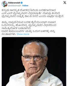 ಎಕ್ಸ್ ಖಾತೆಯಲ್ಲಿ ಟ್ವೀಟ್ ಮಾಡಿದ ಸಿಎಂ ಸಿದ್ದರಾಮಯ್ಯ ಅವರು, ಕನ್ನಡ ಸಾರಸ್ವತ ಲೋಕದ ಹಿರಿಯ ಬರಹಗಾರರಾದ ಎಸ್.ಎಲ್.ಭೈರಪ್ಪನವರ ನಿಧನವಾರ್ತೆ ನೋವು ತಂದಿದೆ. ಭೈರಪ್ಪನವರ ಆತ್ಮಕ್ಕೆ ಶಾಂತಿ ಸಿಗಲಿ ಎಂದು ಪ್ರಾರ್ಥಿಸುತ್ತೇನೆ. ತಮ್ಮ ಆಪ್ತವೆನಿಸುವ ಬರಹ ಶೈಲಿಯಿಂದಾಗಿ ಅಪಾರ ಓದುಗರನ್ನು ಹೊಂದಿದ್ದ ಭೈರಪ್ಪನವರ ನಿಧನದಿಂದ ಸಾಹಿತ್ಯಲೋಕ ಬಡವಾಗಿದೆ. ಅವರ ಕುಟುಂಬವರ್ಗ ಮತ್ತು ಓದುಗ ಬಳಗಕ್ಕೆ ನನ್ನ ಸಂತಾಪಗಳು ಎಂದು ಪೋಸ್ಟ್ ಹಂಚಿಕೊಂಡಿದ್ದಾರೆ.