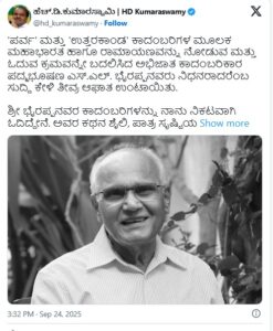 ಕೇಂದ್ರ ಸಚಿವ ಎಚ್.ಡಿ.ಕುಮಾರಸ್ವಾಮಿ, “ಪರ್ವ ಮತ್ತು ಉತ್ತರಕಾಂಡ ಕಾದಂಬರಿಗಳ ಮೂಲಕ ಮಹಾಭಾರತ ಹಾಗೂ ರಾಮಾಯಣವನ್ನು ನೋಡುವ ಮತ್ತು ಓದುವ ಕ್ರಮವನ್ನೇ ಬದಲಿಸಿದ ಅಭಿಜಾತ ಕಾದಂಬರಿಕಾರ ಪದ್ಮಭೂಷಣ ಎಸ್.ಎಲ್. ಭೈರಪ್ಪನವರು ನಿಧನರಾದರೆಂಬ ಸುದ್ದಿ ಕೇಳಿ ತೀವ್ರ ಆಘಾತ ಉಂಟಾಯಿತು” ಎಂದು ಶೋಕ ವ್ಯಕ್ತಪಡಿಸಿದ್ದಾರೆ.