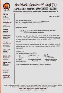 18% ಇರುವ ಜಿಎಸ್ಟಿ ಯನ್ನ 5%ಗೆ ಇಳಿಸುವಂತೆ ಬೆಂಗಳೂರು ಹೊಟೇಲ್ ಮಾಲೀಕರ ಸಂಘ ಕೇಂದ್ರ ಹಣಕಾಸು ಸಚಿವೆ ನಿರ್ಮಲಾ ಸೀತಾರಾಮನ್ ಅವರಿಗೆ ಮನವಿ ಮಾಡಿದ್ದಾರೆ.