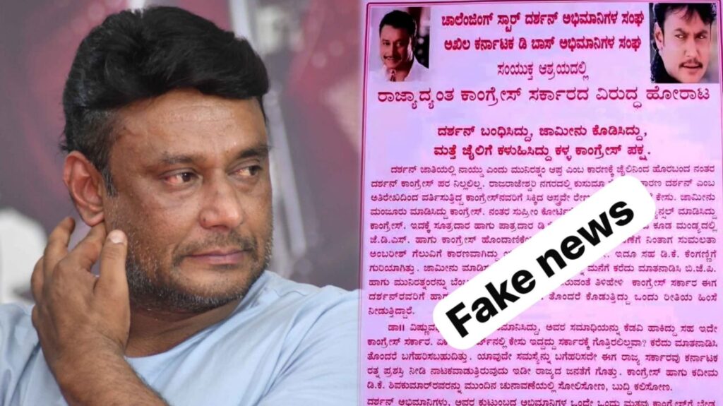 ಬೆಂಗಳೂರು : ರೇಣುಕಾಸ್ವಾಮಿ ಕೊಲೆ ಪ್ರಕರಣದಲ್ಲಿ ಜೈಲು ಸೇರಿರುವ ನಟ ದರ್ಶನ್ ಪರಪ್ಪನ ಅಗ್ರಹಾರದಲ್ಲಿ ನರಕಯಾತನೆ ಅನುಭವಿಸುತ್ತಿದ್ದಾರೆ. ಈ ಮಧ್ಯೆ ದರ್ಶನ್ ಅಭಿಮಾನಿಗಳ ಹೆಸರಲ್ಲಿ ಕಿಡಿಗೇಡಿಗಳು ಪೋಸ್ಟರ್ವೊಂದನ್ನು ವೈರಲ್ ಮಾಡಿದ್ದಾರೆ. ‘ದರ್ಶನ್ ಬಂಧಿಸಿದ್ದು, ಜಾಮೀನು ಕೊಡಿಸಿದ್ದು, ಮತ್ತೆ ಜೈಲಿಗೆ ಕಳುಹಿಸಿದ್ದು ಕಳ್ಳ ಕಾಂಗ್ರೆಸ್ ಸರ್ಕಾರದ ವಿರುದ್ಧ ರಾಜ್ಯಾದ್ಯಂತ ಹೋರಾಟ’ ಎಂಬ ಪೋಸ್ಟರ್ನ್ನು ಕಿಡಿಗೇಡಿಗಳು ಹರಿಬಿಟ್ಟಿದ್ದರು. ಇದೀಗ ಡಿ ಕಂಪನಿ ಫ್ಯಾನ್ಸ್ ಅಸೋಸಿಯೇಷನ್ ಇದು ಫೇಕ್ ನ್ಯೂಸ್ ಎಂದು ಸ್ಪಷ್ಟನೆ ಕೊಟ್ಟಿದೆ.