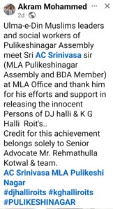 ಜಾಮೀನು ಕೊಡಿಸಲು ಸಹಕರಿಸಿದ ಶಾಸಕ ಎಸಿ ಶ್ರೀನಿವಾಸ್ಗೆ ಮುಸ್ಲಿಂ ಮುಖಂಡ ಅಕ್ರಂ ಅಹಮದ್ ಅಭಿನಂದನೆ ಸಲ್ಲಿಸಿದ್ದಾರೆ. ಈ ಬಗ್ಗೆ ಮುಸ್ಲಿಂ ಮುಖಂಡ ಅಕ್ರಂ ಅಹಮದ್ ಸೋಶಿಯಲ್ ಮೀಡಿಯಾದಲ್ಲಿ ಪೋಸ್ಟ್ ಹಂಚಿಕೊಂಡಿದ್ದು, ಶಾಸಕ ಎಸಿ ಶ್ರೀನಿವಾಸ್ ಅವರನ್ನು ಭೇಟಿಯಾಗಿ ಡಿಜೆ ಹಳ್ಳಿ ಮತ್ತು ಕೆಜಿ ಹಳ್ಳಿಯ ಮುಗ್ಧ ವ್ಯಕ್ತಿಗಳನ್ನು ಬಿಡುಗಡೆ ಮಾಡುವಲ್ಲಿ ಅವರ ಪ್ರಯತ್ನ ಮತ್ತು ಬೆಂಬಲಕ್ಕಾಗಿ ಧನ್ಯವಾದ. ಈ ಸಾಧನೆಯ ಕೀರ್ತಿ ಹಿರಿಯ ವಕೀಲ ರೆಹಮತುಲ್ಲಾ ಕೊತ್ವಾಲ್ ಮತ್ತು ತಂಡಕ್ಕೆ ಮಾತ್ರ ಸಲ್ಲುತ್ತದೆ ಎಂದಿದ್ದಾರೆ.