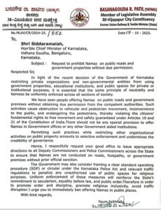 ಕರ್ನಾಟಕ ಪೊಲೀಸ್ ಕಾಯ್ದೆ ಮತ್ತು ಸಂಬಂಧಿತ ಸಂಚಾರ ನಿಯಮಾವಳಿಗಳ ಅಡಿಯಲ್ಲಿ ಸಾರ್ವಜನಿಕ ಸ್ಥಳಗಳನ್ನು ಧಾರ್ಮಿಕ ಉದ್ದೇಶಗಳಿಗೆ ಅನಧಿಕೃತವಾಗಿ ಬಳಸುವುದನ್ನು ತಡೆಗಟ್ಟಲು ಸ್ಪಷ್ಟವಾದ SOPಯನ್ನು ಸರ್ಕಾರ ರೂಪಿಸಬೇಕು. ಆ ಮೂಲಕ ಧರ್ಮನಿರಪೇಕ್ಷತೆ, ಕಾನೂನಿನ ಸಮಾನತೆ ಮತ್ತು ಸಾರ್ವಜನಿಕ ಶಿಸ್ತಿನ ಬಗ್ಗೆ ತನ್ನ ಬದ್ಧತೆಯನ್ನು ದೃಢಪಡಿಸಬೇಕು ಎಂದು ಶಾಸಕ ಯತ್ನಾಳ್ ಆಗ್ರಹಿಸಿದ್ದಾರೆ.