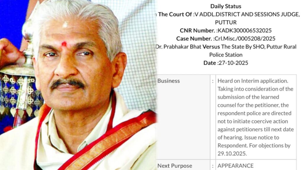 ಪೊಲೀಸರ ಎಫ್‌ಐಆರ್ ಮತ್ತು ನೋಟಿಸ್ ಪ್ರಶ್ನಿಸಿ ಡಾ. ಕಲ್ಲಡ್ಕ ಪ್ರಭಾಕರ ಭಟ್ ಅವರು ನ್ಯಾಯಾಲಯದ ಮೊರೆ ಹೋಗಿದ್ದರು. ತಮ್ಮ ವಿರುದ್ಧದ ಎಫ್‌ಐಆರ್ ‘ದ್ವೇಷಪೂರಿತ’ ಎಂದು ಅವರು ವಾದಿಸಿದ್ದರು. ಅರ್ಜಿ ವಿಚಾರಣೆ ನಡೆಸಿದ ನ್ಯಾಯಾಲಯವು, ಪೊಲೀಸರಿಗೆ ನೋಟಿಸ್ ಜಾರಿಗೊಳಿಸಿದೆ. ಅಲ್ಲದೆ, ಅಕ್ಟೋಬರ್ 29 ರಂದು ನಡೆಯಲಿರುವ ಮುಂದಿನ ವಿಚಾರಣೆವರೆಗೆ ಕಲ್ಲಡ್ಕ ಪ್ರಭಾಕರ ಭಟ್ ವಿರುದ್ಧ ಯಾವುದೇ ಬಲವಂತದ ಕ್ರಮ ಜರುಗಿಸದಂತೆ ಮಹತ್ವದ ಸೂಚನೆ ನೀಡಿದೆ. ಇದರಿಂದಾಗಿ ಅಕ್ಟೋಬರ್ 29ರವರೆಗೆ ಭಟ್‌ ಅವರಿಗೆ ಬಂಧನದ ಭೀತಿಯಿಂದ ತಾತ್ಕಾಲಿಕ ರಿಲೀಫ್ ಸಿಕ್ಕಂತಾಗಿದೆ.