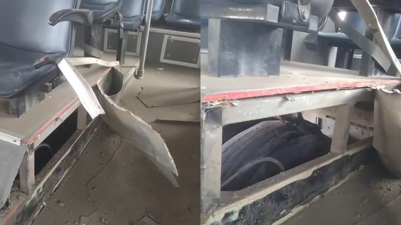 ನಿನ್ನೆ ಬಸ್ ಅತ್ತಿಬೆಲೆಯಿಂದ ಮೆಜೆಸ್ಟಿಕ್ ಕಡೆ ಹೋರಟಿತ್ತು. ಈ ವೇಳೆ ಬಸ್ನ ಟೈರ್ ಸ್ಫೋಟಗೊಂಡಿದೆ. ಇದರಿಂದ ಬಸ್ನ ಟೈರ್ ಬಳಿಯ ಸೀಟ್ಗೂ ಹಾನಿಯಾಗಿದೆ. ಅಲ್ಲದೇ ಕೆಳಭಾಗದಲ್ಲಿ ಛಿದ್ರವಾಗಿ ಬಸ್ ತುಂಬ ಧೂಳು ಆವರಿಸಿದೆ.